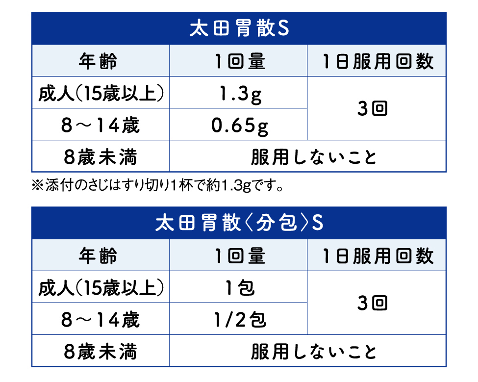 【効能・効果】飲みすぎ、胸やけ、胃部不快感、胃弱、胃もたれ、食べすぎ、胃痛、消化不良、消化促進、食欲不振、胃酸過多、胃部・腹部膨満感、はきけ(胃のむかつき、二日酔・悪酔のむかつき、悪心)、嘔吐、胸つかえ、げっぷ、胃重 【用法・用量】次の量を食後又は食間に水又はぬるま湯で服用してください。※食間とは食後2〜3時間のことをいいます。※使用期限 太田胃散S:本製品の底面に記載しています。太田胃散<分包>S:本製品の裏面に記載しています。